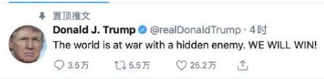 当地时间17日,特朗普发布推特并置顶:“世界正与一个隐藏着的敌人交战,我们会赢的!”