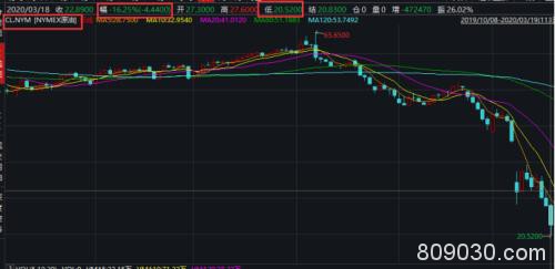 当天国际油价全线下跌,美国NYMEX原油期货主力合约收跌16.25%,报22.89美元/桶,创近20年来新低,盘中一度低至20.52美元,暴跌超过20%。