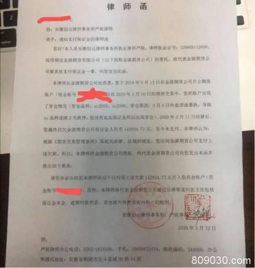 经3月11日结算后,该投资者仍欠金源期货公司保证金14.29万元。律师函中要求该名投资者收函十日内偿还欠款,否则期货公司将通过法律渠道追偿。