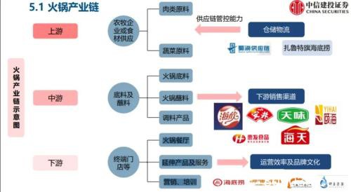 火锅产业链可分为上游、中游、下游,上游主要指农牧企业或食材供应,中游主要指底料及蘸料,下游包括火锅餐厅、延伸产品及服务、营销和培训等。
