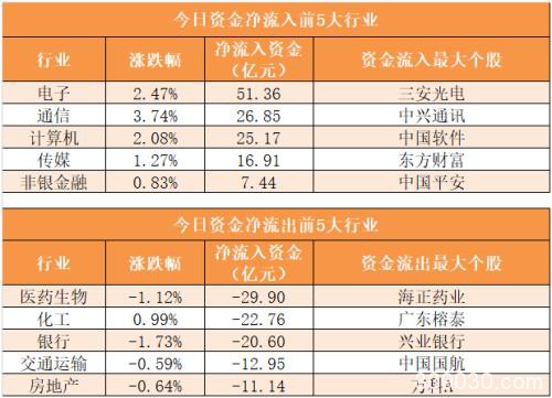 3、电子行业净流入51.36亿元居首