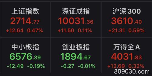 Wind数据显示,截至午间收盘,上证指数上涨0.47%,报2714.77点;深证成指上涨0.11%,报10031.36点;创业板指下跌0.01%,报1894.67点。
