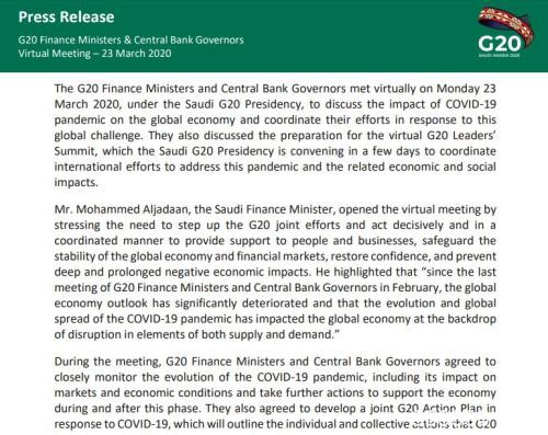 北京时间周一晚上,G20财长及央行行长紧急召开视频会议,就COVID-19疫情对全球经济的影响进行了讨论,并协调共同措施应对此次的全球挑战。
