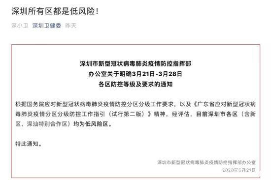 截至3月23日,深圳本地新增病例已超过一个月为“0”,深圳市新型冠状病毒肺炎疫情防控指挥部办公室在3月21日明确,目前深圳市各区(含新区、深汕特别合作区)均为低风险区。
