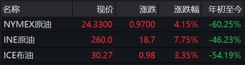 截至收盘,NYMEX原油期货报24.33美元/桶,涨4.15%;ICE布油报30.27美元/桶,涨3.35%。
