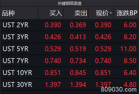 债市方面,多数美债收益率24日走高。Wind数据显示,2年期美债收益率涨6个基点报0.390%,3年期美债收益率涨8.2个基点报0.426%,5年期美债收益率涨11个基点报0.529%,10年期美债收益率涨6.4个基点报0.851%,30年期美债收益率涨4.8个基点报1.397%。