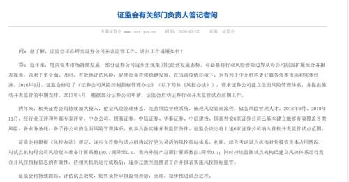 证监会有关部门负责人表示,两年来,相关证券公司持续加大投入,健全风险管理体系,完善风险管理系统,梳理风险管理流程,储备风险管理人才。2018年9月、2019年11月,经行业互评和外部专家评审,中金公司、招商证券、中信证券、华泰证券、中信建投、国泰君安6家证券公司初步具备实施并表监管条件,证监会决定将其纳入首批并表监管试点范围。