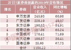 3月27日,招商证券(行情600999,诊股)、银河证券、光大证券(行情601788,诊股)、国海证券(行情000750,诊股)、申万宏源(行情000166,诊股)、广发证券(行情000776,诊股)、东方证券(行情600958,诊股)7家券商发布2019年年报。7家券商2019年合计实现营收1158.22亿元,实现归母净利润292.76亿元。