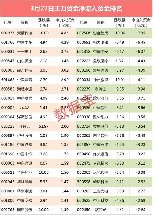 个股方面,主力资金流入超亿元的有27股,其中建筑装饰和机械设备各占4股。近期新上市次新股天箭科技(行情002977,诊股)周五首次开板,资金流入4.85亿元,流入居首。