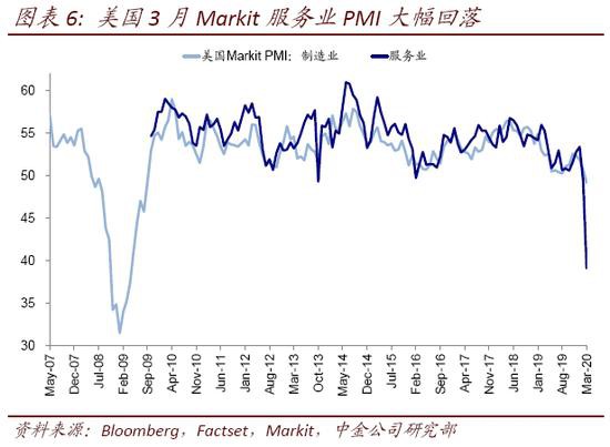 2) 基本面下行压力逐渐开始显现,近期市场盈利预期下调逐渐加速。因为疫情和“抗疫”导致的经济停摆对于基本面和企业盈利的影响将逐渐开始显现。3月美国PMI已经开始明显趋弱,特别是受疫情影响较大的服务业。同时,企业盈利的市场一致预期也在快速下调。