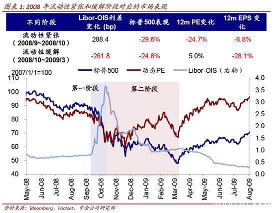 估值先于市场见底,底部基本对应流动性冲击高峰。从2008年的经验来看,虽然后续还会出现波折,但整体上PE(2008年10月)先于市场见底(2009年3月),当然这也与作为分母EPS持续下调有关。粗略看,2008年标普500指数PE底部大体出现在10月附近,基本对应流动性冲击的高峰,也即Libor-OIS利差的最高点。随后虽然还会出现波折,但基本没有再出现非常大幅的收缩。