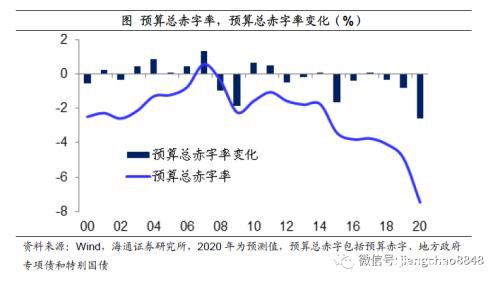 2019年的财政预算赤字总额为4.91万亿,最终的实际财政赤字为4.85万亿。而在考虑了以上三项构成之后,我们预计2020年的财政预算赤字总额为7.91万亿,同比增长约3万亿。