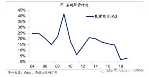 2019年,基建投资增速仅为3.3%,连续两年保持在接近于0的历史最低位水平。
