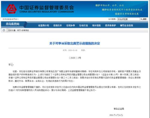违背客户意愿买卖基金、擅自修改客户资料,近日,青岛证监局向招商证券(行情600999,诊股)股份有限公司(以下简称“招商证券”)营业部一名员工李某出具了警示函。