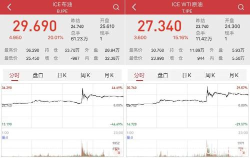 受此消息刺激,国际油价直接暴走。其中,美国WTI原油价格盘中暴涨30%,突破27美金;布伦特原油更是一度暴涨46%,突破36美元。截至收盘,美国WTI 5月原油期货上涨5.01美元,涨幅24.67%报25.32美元/桶。布伦特6月原油期货收涨5.20美元,涨幅21.02%报29.94美元/桶。美油、布油均创史上最大单日百分比涨幅。