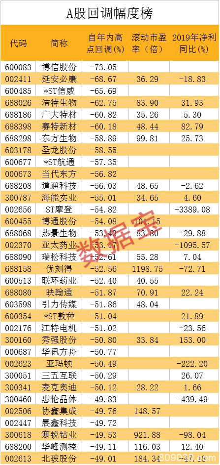 除博信股份外,还有27只股票腰斩。其中,延安必康(行情002411,诊股)最新价7.77元,较年内高点24.8元下跌超68%位居回调榜次席;*ST信威(行情600485,诊股)最新价1.41元,年内高点4.11元,下跌超65%。此外,洁特生物(行情688026,诊股)、广大特材(行情688186,诊股)、赛特新材(行情688398,诊股)等个股回调均超过60%。