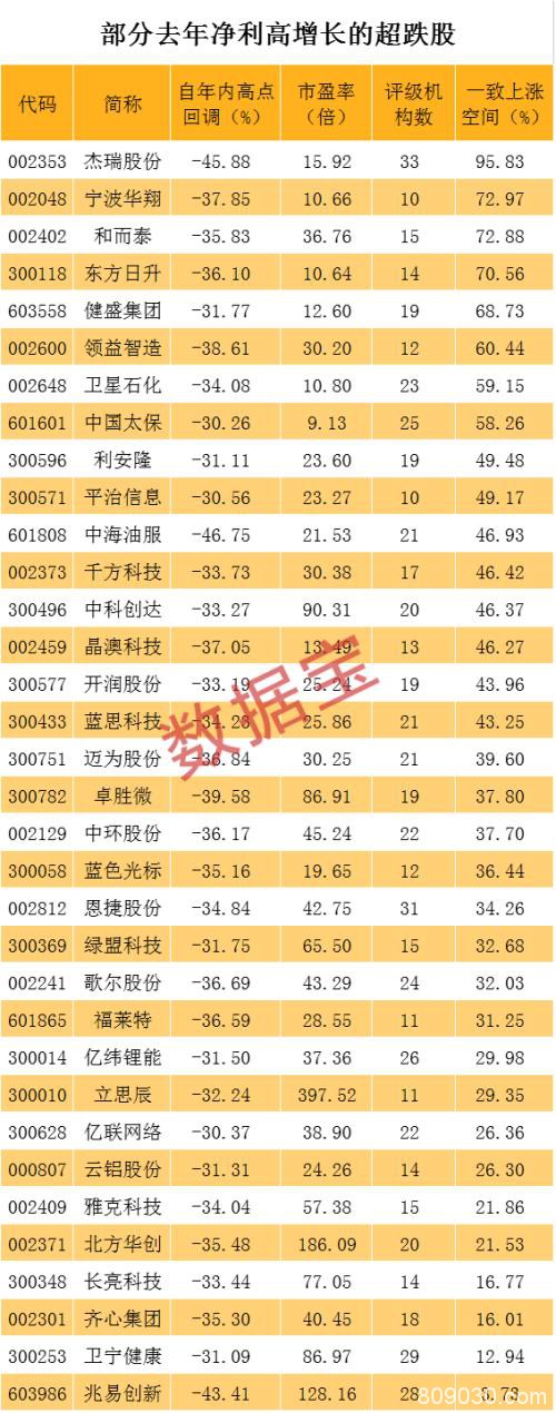 在超跌且机构关注度较高的个股中,有35只股票去年净利同比增长超过30%。其中,中海油服(行情601808,诊股)净利增长超过34倍居首;领益智造(行情002600,诊股)、东方日升(行情300118,诊股)、蓝思科技(行情300433,诊股)等个股净利增速均超过300%,卓胜微(行情300782,诊股)、亿纬锂能(行情300014,诊股)、云铝股份(行情000807,诊股)、长亮科技(行情300348,诊股)、杰瑞股份、立思辰(行情300010,诊股)等个股净利翻倍增长。