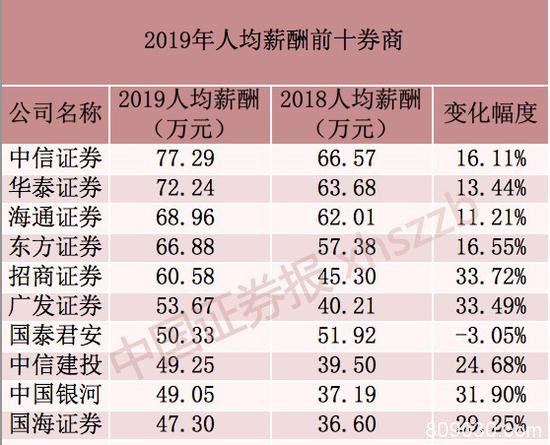其中,华安证券(行情600909,诊股)人均年薪从2018年的22.02万元提升至2019年的32.08万元,提升幅度达45.69%;招商证券、广发证券、浙商证券(行情601878,诊股)、中国银河(行情601881,诊股)证券、华西证券(行情002926,诊股)加薪幅度均超30%。国泰君安证券2019年人均年薪出现小幅下滑。