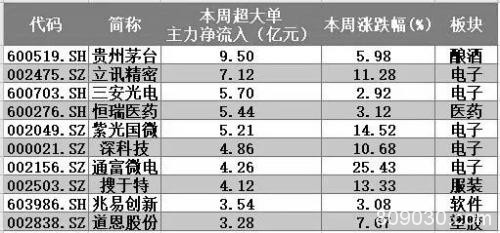 在行业方面,本周超大单主力资金重拾科技股,榜单前10名中半数以上被电子股和软件股占据,部分个股周内涨幅相当可观,例如通富微电(行情002156,诊股)就超过25%。不过,出人意料之外的是,净流入金额占据首位的竟是“股王”贵州茅台(行情600519,诊股),达到9.5亿元,同时周内涨幅也达到了6%,这或与北向资金本周净流入金额较大有关。另一只长期受北向资金关注的个股恒瑞医药(行情600276,诊股)也位列榜中。