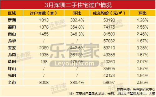 分区来看,3月宝安二手住宅成交最多,过户2089套,环比上涨442.6%;龙岗过户1935套,环比上涨361.8%;南山排名第三,过户1455套,环比上涨346.3%。