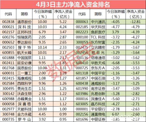 沪指4月3日下跌0.6%,主力资金全天净流出294.55亿元。其中,中小板主力资金净流出72.53亿元,创业板主力资金净流出56.35亿元,沪深300成份股主力资金净流出102.54亿元。