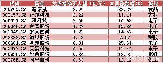 从本周登上两市成交龙虎榜的168只个股来看,游资的关注热点与超大单主力资金保持同步,比较集中于电子股,深科技(行情000021,诊股)、台基股份(行情300046,诊股)、紫光国微(行情002049,诊股)游资净流入均超过1亿元,周内涨幅也均超过10%。不过,游资最青睐的却是预计首季净利增长15%至30%的食品股新诺威(行情300765,诊股),周内大涨28%创出上市1年以来的历史新高,3亿元游资抢入。