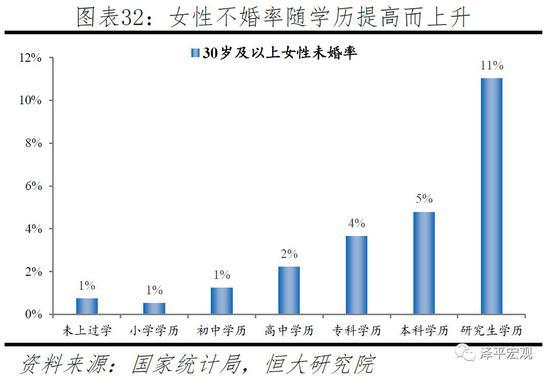 2)因婚姻市场匹配问题及单身主义等,“剩女”规模快速增加至约600万,学历越高“剩下”的概率越大。在婚姻市场中,女性多偏好不低于自身条件的男性,男性多偏好不高于自身条件的女性。这意味着即便婚姻市场男女性别比平衡,条件最好的女性和条件最差的男性也最有可能被剩下。1990年中国30岁及以上未婚女性仅为46万,2000年超过154万,2015年攀升至590万;其中,30-34岁女性未婚率从0.6%攀升至7.0%。从城乡分布看,2015年城市30岁及以上女性未婚率为2.4%,明显超过建制镇的1.0%、农村的0.9%。从受教育程度看,30岁及以上研究生学历女性未婚率高达11%,远高于本科学历及以下女性未婚率的5%。