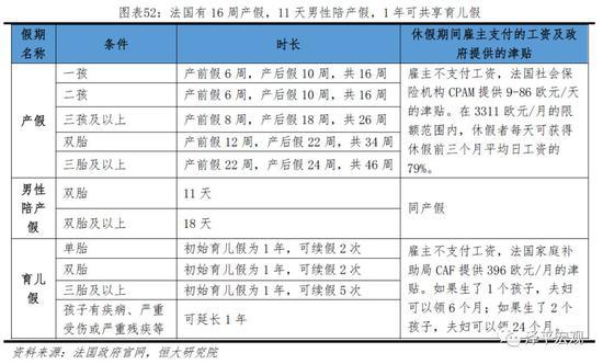 国际经验:鼓励生育效果如何?1)OECD经验:鼓励生育哪招最管用?OECD国家鼓励生育政策体系主要涵盖保障休假、经济补贴、托幼服务、女性就业支持等四个方面。其中,休假长度和生育水平相关性弱,其中原因在于延长女性休假时间与保障其就业权益存在一定矛盾。家庭福利开支比例与生育水平有一定相关,2013年OECD国家家庭福利开支与GDP的比例平均约2.4%。入托率与生育水平有一定相关,0-2岁入托率越高,生育水平越高,OECD国家0-2岁平均入托率为34.2%。女性就业权益保护与生育水平有一定相关,男女就业差距越小,生育水平越高。2)法国:积极推进家庭和工作的平衡,总和生育率接近2。法国早在二战前就开始鼓励生育,通过完善细致的津贴体系、多样化的托幼服务和打造家庭友好型企业氛围等来实现工作和家庭的平衡,2016年总和生育率达1.96。2013年法国家庭福利开支占GDP比重达3.7%,在OECD国家中排名第三;2014年0-2岁入托率达51.9%,远高于OECD水平。法国大企业携手打造家庭友好型企业氛围,男女劳动参与率差距不到10%;此外,占比约9%的移民对法国生育率回升也起到一定作用。3)日本:传统性别分工激化工作与家庭矛盾,总和生育率停留在1.4左右,人口形势严峻。日本在1970年代之前一度控制人口,1990年代开始鼓励生育,但2016年总和生育率仍停留在1.4,低生育率导致日本人口于2008年见顶、2100年将比峰值减少53%,并且老龄化高龄化程度为全球之最。原因在于:一方面日本错过了调整生育政策的最佳时机。二是日本鼓励生育力度较弱,家庭福利开支占比仅1.5%,在OECD国家中排名倒数。三是日本“男主外、女主内”性别分工较为普遍,职场性别歧视严重,越来越多日本女性放弃结婚生育,1990-2015年50岁以上女性终身未婚率从4.3%激增至14.6%。