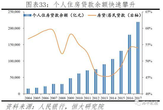 1)房价快速攀升,居民债务压力快速上升,2004-2017年房贷收入比从17%增至44%。1998年房改以来,房价总体保持大幅上涨,给家庭抚养孩子和为子女结婚购房带来了很大压力,1998-2018年全国新建商品住宅均价从1854元/平上涨至8542元。2004-2017年中国个人购房贷款余额从1.6万亿元增至21.9万亿元,增长13.7倍,占居民贷款余额的比例大致在50%以上,2017年为54%。房贷收入比(个人购房贷款余额/可支配收入)从17%增至44%,带动住户部门债务收入比(居民债务余额/可支配收入)从29%增至80%。现实中还有不少居民通过消费贷、信用贷等形式凑集购房资金,实际的房贷收入比可能更高。