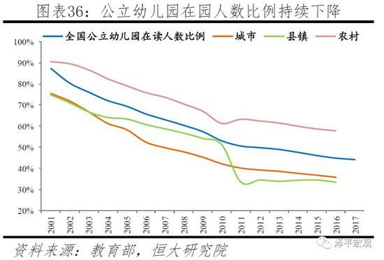 2)教育成本明显攀升,特别是公立幼儿园供给严重不足,1997-2017年中国公立幼儿园在读人数比例从95%降至44%。当前教育成本主要包括幼儿园学杂费、幼儿园及小学初高中阶段辅导班费用、大学学费及生活费等。根据新浪教育《2017中国家庭教育消费白皮书》抽样统计,学前教育阶段教育支出占家庭年收入的26%,义务教育和高中教育阶段占21%,大学阶段占29%。公立幼儿园供给大幅下降,许多家庭被迫选择价格昂贵的私立幼儿园,是学前教育费用高昂的一个重要原因。1997年公立幼儿园数占比86.5%,在园人数占比94.6%。从2001年开始幼儿园被大量推向社会办学,加上基层中小学大量撤点并校,尤其在农村,导致农村、县镇、城市幼儿园分别大幅减少4、1.5、0.9万所。2001-2017年全国幼儿园所数从11.2万增至25.5万所,公立幼儿园数从6.7万所减少至2010年的4.8万所,再回升至2017年为9.5万所,占比从60.1%降至30.7%再回升至37.1%;但公立幼儿园在园人数占比未有回升,从83.1%持续降至44.1%。城市、县镇、农村的公立幼儿园在园人数占比分别从75.5%、74.8%、90.6%下降至2016年的35.7%、33.4%、57.7%。此外,当前双职工父母面临中小学子女的接送难题。不少地方甚至还要求由父母批改学生家庭作业、并讲解错题,逐渐演变为“家庭作业演变成为家长作业”、“教师减负、家长增负”。