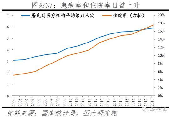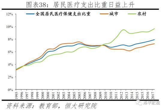 3)医疗费用持续上升,1995-2017年居民医疗保健支出上涨22.4倍,远超可支配收入9.2倍的涨幅。由于环境污染、工作生活压力加大及人口老龄化等原因,患病率上升,医疗费用也持续上升,影响家庭生育决策。2004-2017年,中国居民中国居民平均到医疗机构诊疗人次从3.07人次上升至5.88人次,住院率从5.1%升至17.6%。根据《2017年我国卫生健康事业发展统计公报》,公立三级医院人均门诊费用为306元、人均住院费用13088元、日均住院费用1334元。在此影响下,1995-2017年全国居民人均医疗保健支出从62元升至1451元,上涨22.4倍,远高于人均可支配收入9.2倍、人均消费性支出8.4倍的涨幅;其占消费性支出的比重从3.2%上升至7.9%,其中城市从3.1%升至7.3%,农村从3.2%升至9.7%。