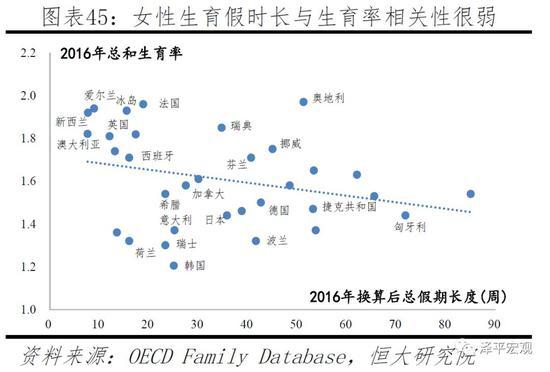 国际经验:鼓励生育效果如何?1)OECD经验:鼓励生育哪招最管用?OECD国家鼓励生育政策体系主要涵盖保障休假、经济补贴、托幼服务、女性就业支持等四个方面。其中,休假长度和生育水平相关性弱,其中原因在于延长女性休假时间与保障其就业权益存在一定矛盾。家庭福利开支比例与生育水平有一定相关,2013年OECD国家家庭福利开支与GDP的比例平均约2.4%。入托率与生育水平有一定相关,0-2岁入托率越高,生育水平越高,OECD国家0-2岁平均入托率为34.2%。女性就业权益保护与生育水平有一定相关,男女就业差距越小,生育水平越高。2)法国:积极推进家庭和工作的平衡,总和生育率接近2。法国早在二战前就开始鼓励生育,通过完善细致的津贴体系、多样化的托幼服务和打造家庭友好型企业氛围等来实现工作和家庭的平衡,2016年总和生育率达1.96。2013年法国家庭福利开支占GDP比重达3.7%,在OECD国家中排名第三;2014年0-2岁入托率达51.9%,远高于OECD水平。法国大企业携手打造家庭友好型企业氛围,男女劳动参与率差距不到10%;此外,占比约9%的移民对法国生育率回升也起到一定作用。3)日本:传统性别分工激化工作与家庭矛盾,总和生育率停留在1.4左右,人口形势严峻。日本在1970年代之前一度控制人口,1990年代开始鼓励生育,但2016年总和生育率仍停留在1.4,低生育率导致日本人口于2008年见顶、2100年将比峰值减少53%,并且老龄化高龄化程度为全球之最。原因在于:一方面日本错过了调整生育政策的最佳时机。二是日本鼓励生育力度较弱,家庭福利开支占比仅1.5%,在OECD国家中排名倒数。三是日本“男主外、女主内”性别分工较为普遍,职场性别歧视严重,越来越多日本女性放弃结婚生育,1990-2015年50岁以上女性终身未婚率从4.3%激增至14.6%。