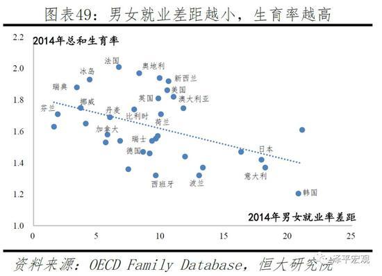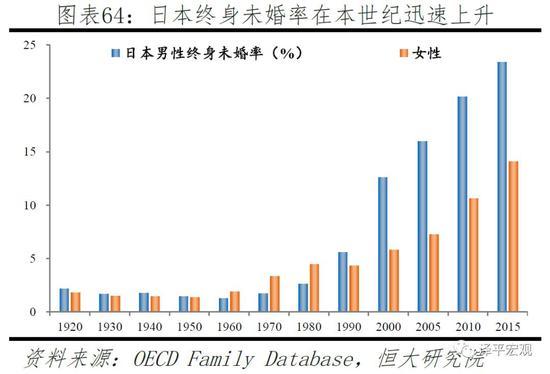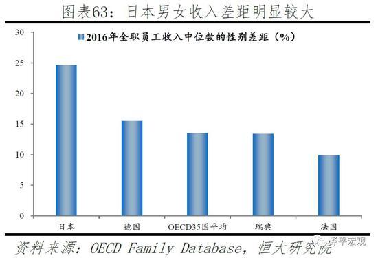 三是日本“男主外、女主内”性别分工较为普遍,职场性别歧视严重越来越多日本女性放弃结婚生育,1990-2015年50岁以上女性终身未婚率从4.3%激增至14.6%。与芬兰、瑞典等国将部分育儿养老工作社会化并由国家承担不同,日本的育儿养老责任多由家庭女性承担,将女性的角色定位为全职家庭主妇的思想仍然存在,“男主外、女主内”思想较为普遍。根据世界银行,2017年日本的女性劳动参与率达50.5%,低于OECD平均的51.3%;2017年日本男女劳动参与率差距达20.1个百分点,高于OECD平均的17.2个百分点。根据OECD,2014年日本的男女就业率差距为17.9个百分点,高于OECD平均的11.8个百分点;2016年日本的全职员工中男性和女性的收入中位数差距为24.6%,高于OECD国家13.5%的平均水平。越来越多的日本女性选择(暂时)放弃家庭,进入职场。根据日本国立社会保障和人口问题研究所,1990、2010、2015年男性终身未婚率分别为5.6%、20.4%、23.4%,女性分别为4.3%、10.6%、14.6%。日本社会已形成了一种不愿结婚和生育的观念,积重难返。