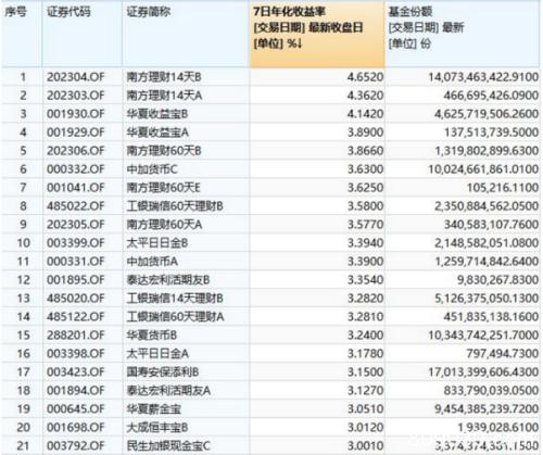 货币基金将同业存单作为最重要的资产配置方向之一。同业存单发行利率全面下行,3个月同业存单(AAA+)报价为1.4368%,刷新低点,也在推动货币基金收益的进一步下降。