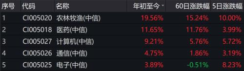 Wind数据显示,截至4月7日上午收盘,今年以来中信一级农林牧渔行业涨幅高达19.56%,同期医药行业涨幅为11.65%,科技板块的计算机、电子、通信则涨幅不足10%。