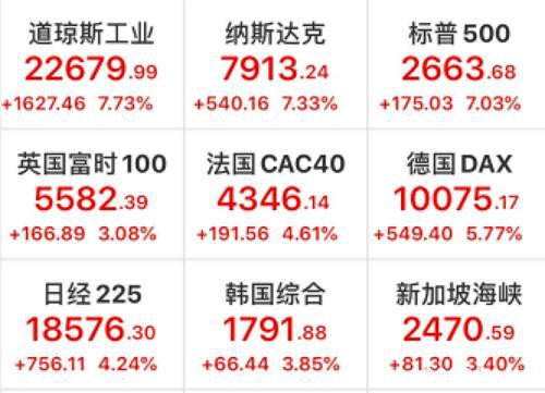 美股再迎狂欢夜。 道琼斯工业指数飙升超1600点,暴涨7.73%,标普500指数和纳斯达克指数分别大涨7.03%和7.33%。