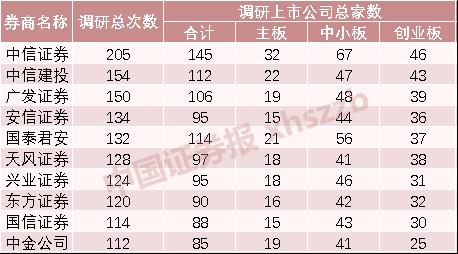 在这194家券商中,调研最为勤奋的是中信证券(行情600030,诊股),一季度共调研145家公司,合计205次;中信建投(行情601066,诊股)、广发证券(行情000776,诊股)调研紧随其后,一季度分别调研154次和150次。调研次数较多的还有安信证券、国泰君安(行情601211,诊股)、兴业证券(行情601377,诊股)、中金公司等。