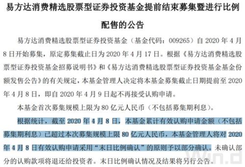 值得注意的是,4月9日,易方达消费精选股票型证券投资基金(以下简称“易方达消费精选”)公告募集超限,将采用“末日比例确认”配售。