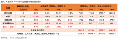 若未来A股纳入MSCI的比例进一步提升至50%,则A股在MSCI全球市场指数和MSCI新兴市场指数里的比重将达到1.2%和9.4%,总增量资金约1.73万亿人民币。若100%纳入,则A股在MSCI全球市场指数和MSCI新兴市场指数里的比重将进一步提升至2.4%和17.2%,总增量资金约3.2万亿人民币。