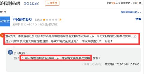 值得注意的是,2020年2月底,又有投资人在网上向济民制药董秘提问:“请核查最近公司股价异动是否存在违规资金大肆对倒操纵行为,同时大股东有没有参与其中。还是公司有未公开重大信息提前泄露,导致知情资金疯狂涌入,请认真核查公告”