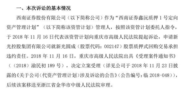 此前在2018年11月,西南证券作为“西南证券鑫沅质押1号定向资产管理计划”(以下简称该)管理人,按照该资管计划委托人指令,代表该资管计划提起诉讼,申请新光控股就“新光圆成”股票质押式回购交易承担违约责任。