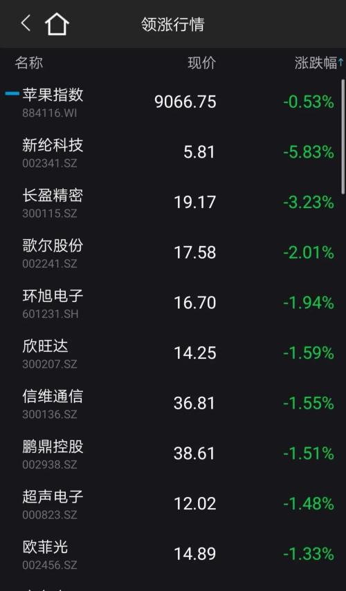 4月16日午间收盘,苹果指数微跌。Wind数据显示,截至收盘时,恒宝股份(行情002104,诊股)股价涨3.89%、领益智造(行情002600,诊股)涨1.35%、科森科技(行情603626,诊股)涨0.90%、东软载波(行情300183,诊股)涨0.75%、长电科技(行情600584,诊股)涨1.19%。歌尔股份(行情002241,诊股)跌2.01%、欣旺达(行情300207,诊股)跌1.59%、鹏鼎控股(行情002938,诊股)跌1.51%、欧菲光(行情002456,诊股)跌1.33%、立讯精密(行情002475,诊股)跌1.04%。