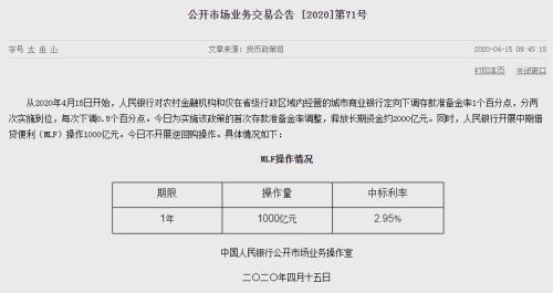 央行公开市场操作连续9个工作日暂停后重启。4月15日消息,人民银行开展1年期中期借贷便利(MLF)操作1000亿元,中标利率为2.95%,此前为3.15%,下调20个基点。