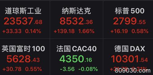 我们再来看看昨晚的美股,截至收盘,道指涨0.14%报23537.68点,标普500涨0.58%报2799.55点,纳指涨1.66%报8532.36点。