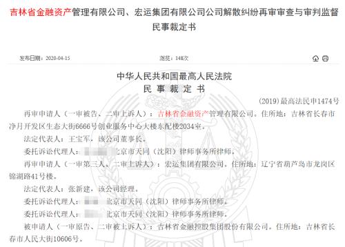 一、二审法院均判决解散吉林AMC后,吉林AMC与宏运集团不服判决,向最高法申请再审。裁判文书网4月15日披露的民事裁定书显示,最高法最终驳回两家公司的再审申请。