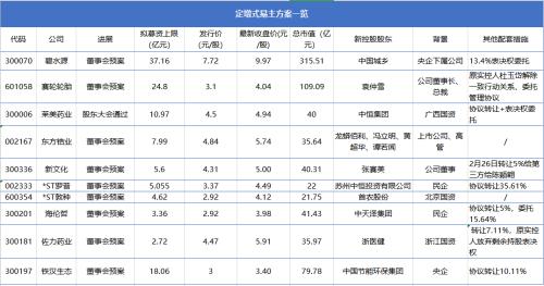在此背景下,定增式易主方案受到追捧。据证券时报・e公司不完全统计,在再融资新规出炉后,已有*ST敦种、赛轮轮胎、海伦哲(行情300201,诊股)、东方锆业(行情002167,诊股)、*ST罗普(行情002333,诊股)、铁汉生态、新文化(行情300336,诊股)、佐力药业(行情300181,诊股)、碧水源、莱美药业(行情300006,诊股)等10家上市公司披露控制权变更方案(或意向),实施锁价式定增是其中重要一环。