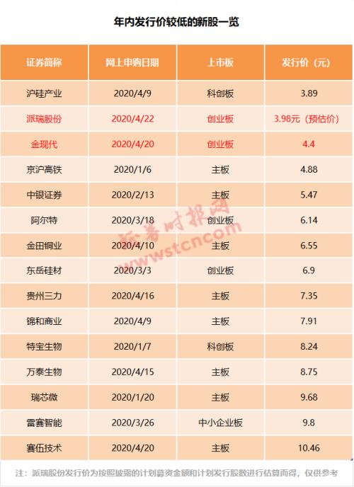 值得注意的是,上述待申购新股中,派瑞股份如果按照披露的计划募资金额和计划发行股数进行估算,发行价为3.98元,这将成为年内发行价第二低的新股,也是年内发行价最低的非科创板新股。金现代的发行价也较低,为4.4元。