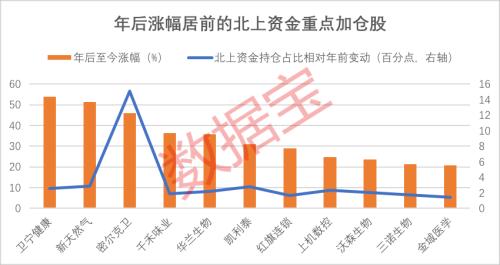 个股胜率方面,年后北上资金加仓幅度居前的50只个股中,33股跑赢大盘,胜率66%。受疫情对市场大幅波动的影响,北上资金胜率虽较去年全年有所下滑,但相对于同期上证指数7.26%的跌幅,这一胜率已十分可观。卫宁健康(行情300253,诊股)、新天然气(行情603393,诊股)、密尔克卫(行情603713,诊股)等6只北上资金重点加仓股节后至今股价已累计上涨超30%。