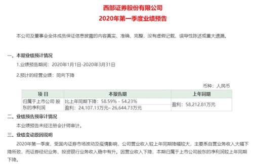 如国元证券(行情000728,诊股)在今年一季度快报中就曾提出,公司一季度营业收入和净利润同比分别下降7.59%和32.93%,主要是因为一季度在经纪业务手续费佣金净收入和自营投资固定收益大幅度增长的情况下,由于受疫情和股市行情回落等影响,公司投行承销、自营权益投资同比有所减少等。西部证券(行情002673,诊股)在一季度业绩预告中指出,受国内证券市场波动及疫情影响,公司营业收入较上年同期降幅较大,主要系自营业务收入大幅下降所致。