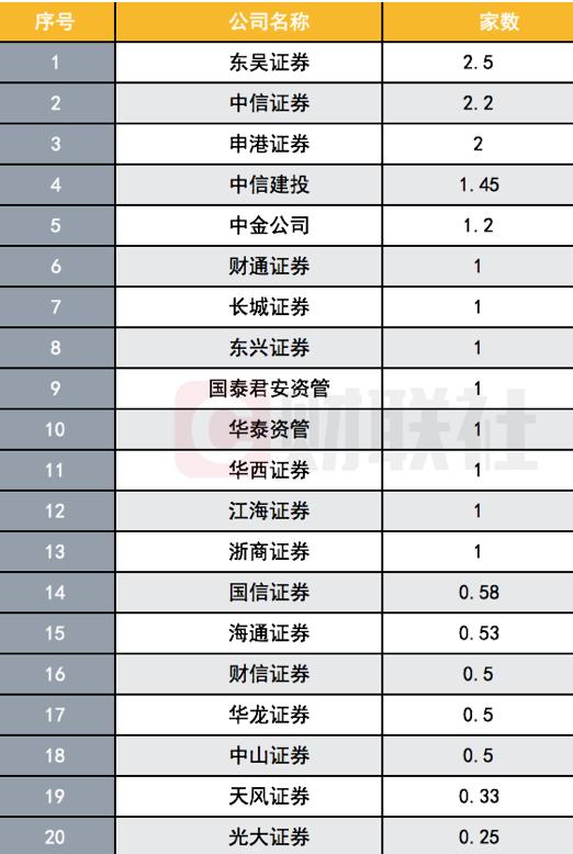长城证券(行情002939,诊股)、东兴证券(行情601198,诊股)、国泰君安资管、华泰资管、华西证券(行情002926,诊股)、江海证券、浙商证券承销家数均为1家,列7~13位。